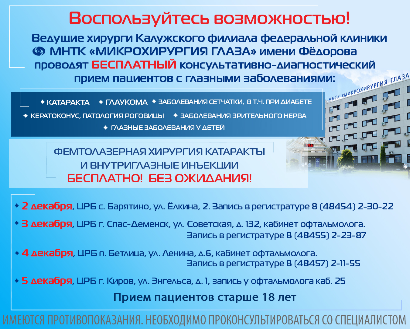 Получите БЕСПЛАТНУЮ консультацию ведущих хирургов Калужского филиала федеральной клиники МНТК «Микрохирургия глаза» имени Фёдорова в ЦРБ своего города.