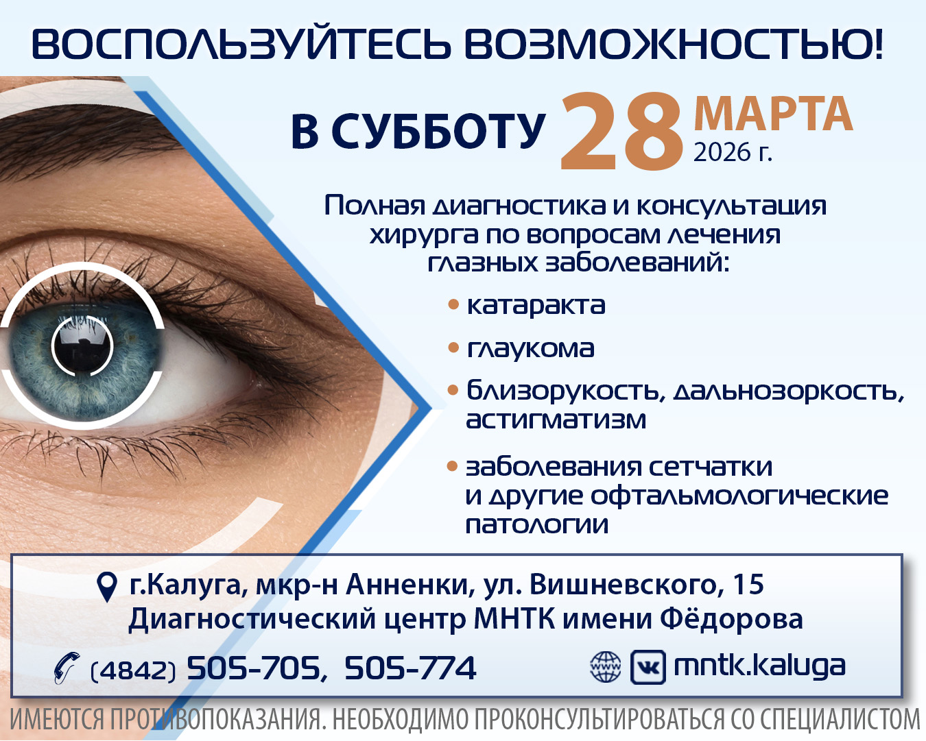Теперь и в СУББОТУ вы можете пройти полное диагностическое обследование и получить консультацию ведущего хирурга Федеральной клиники МНТК имени Фёдорова!