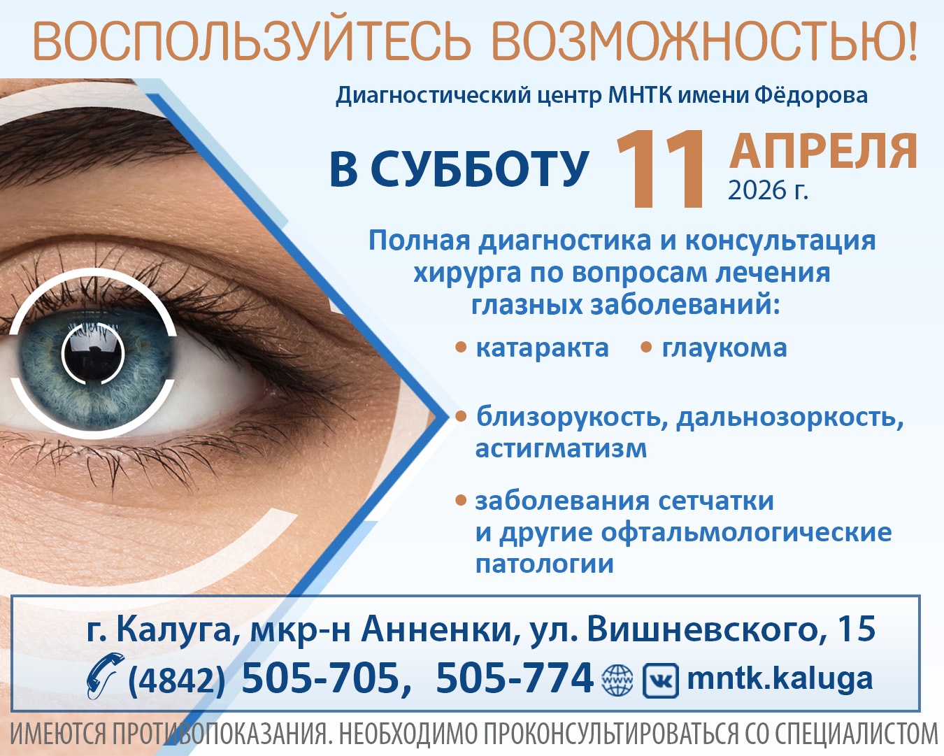 Теперь и в СУББОТУ вы можете пройти полное диагностическое обследование и получить консультацию ведущего хирурга Федеральной клиники МНТК имени Фёдорова!